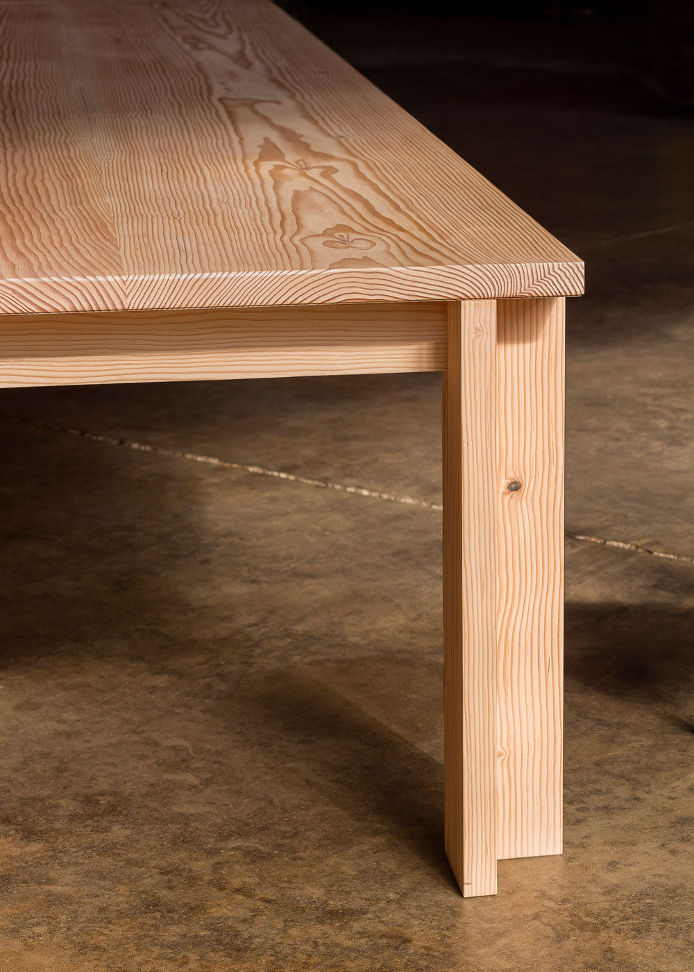 Table One reflects a universal heritage that is fixed without time or place. With an emphasis on function and the sensory response, this vast table, with lengths of up to 380cm (149 2/3”), has a tabletop made from just two planks of astonishingly proportioned planks of Douglas Fir timber. It is designed to be passed from generation to generation, earning the value of time and marks of memories past.